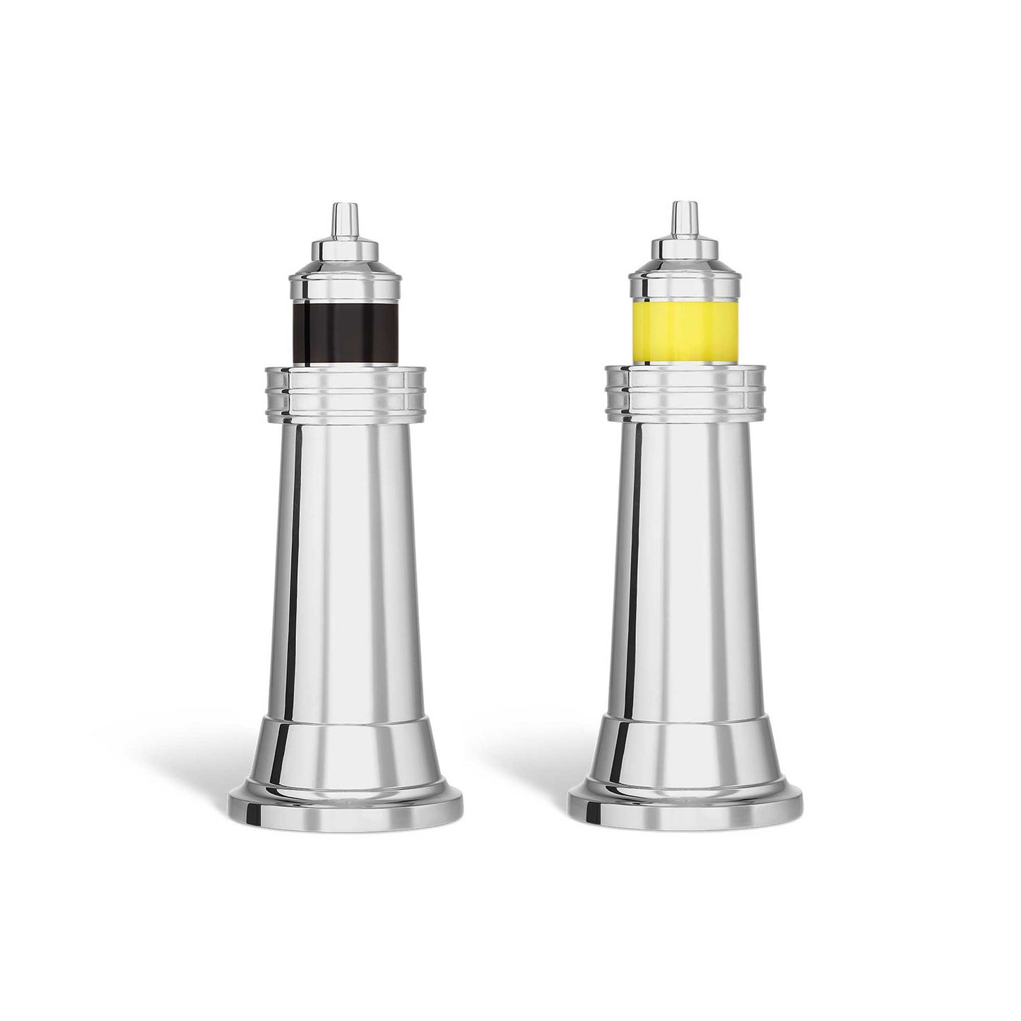 Asprey Lighthouse カクテル シェイカーからインスピレーションを得た、エナメルのディテールが施されたスターリング シルバーのソルト ミルとペッパー ミル。
