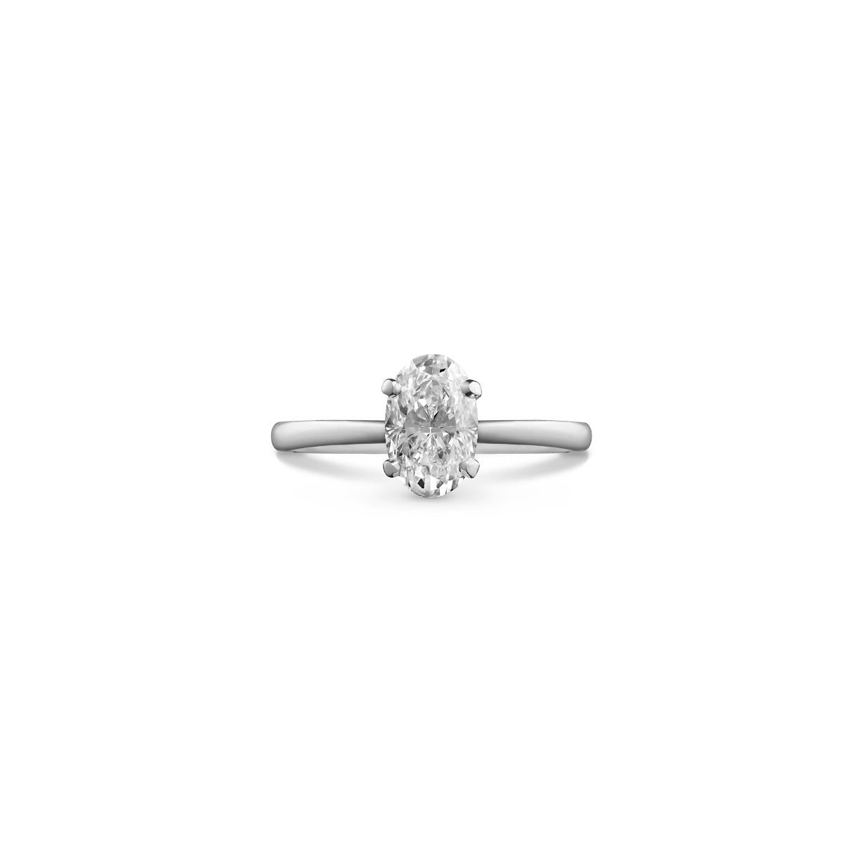 クラシックな 4 爪プラチナ セッティングに取り付けられた一粒石のオーバル ダイヤモンド リング。