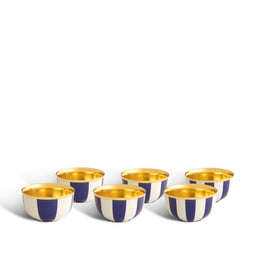 クイーンズ コレクションは、最高級の半透明磁器を使用してウィーンで作られ、Asprey 独自のデザインです。マリンブルーの手描きのストライプモチーフと手描きの24ctゴールドのディテールが特徴のこのコレクションには、イチゴを提供するのに最適なようにデザインされたシャンパンカップとボウルが含まれます。シャンパンの冷たさをより良く保つために、シャンパンカップには金色の裏地が施されています。
