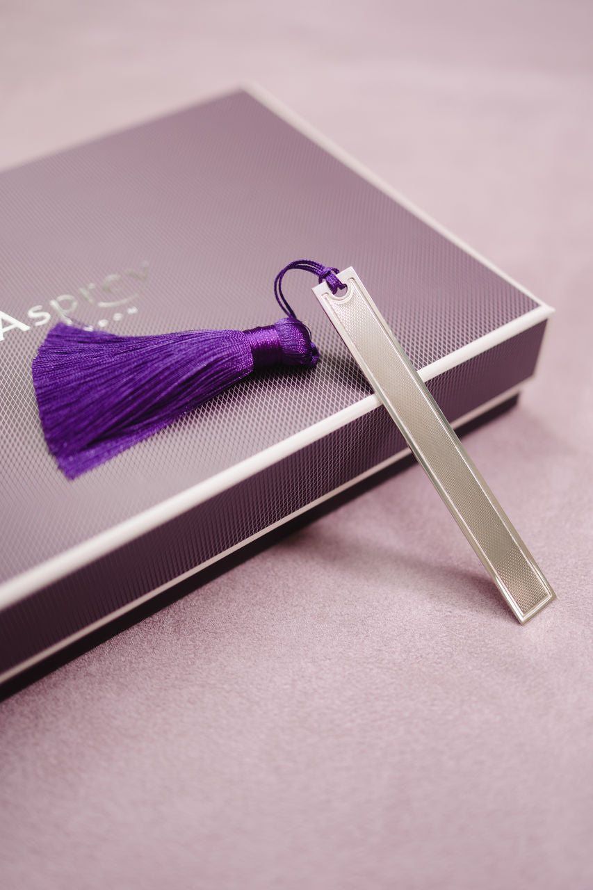 このブックマークは、特徴的なスターリングシルバーで作られており、アスプレイの象徴的なエンジン回転大麦のパターンを誇らしげに示しています。繊細な紫色のシルクタッセルがアクセントになった細身のデザインは、本の愛好家への個人的な彫刻に最適なギフトです。時代を超越したエレガンスに対するアスプレイの取り組みは、この控えめな作品に例示されており、文学の旅を簡単に再開できるようになります。
