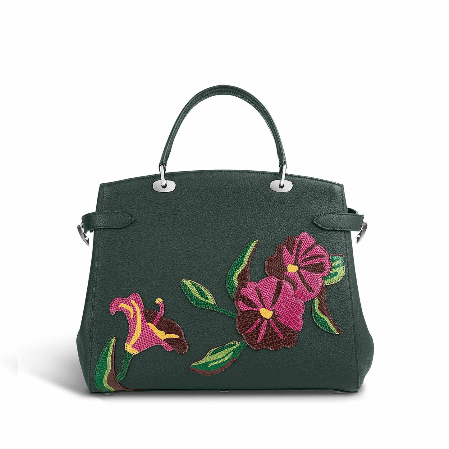 このテイラー ハンドバッグは、アスプレイの品質とスタイルに対する揺るぎないこだわりの証です。マラカイトグリーンのソフトグレインレザーに対照的なトカゲを施し、ハイビスカスの花のユニークなデザインを特徴としています。