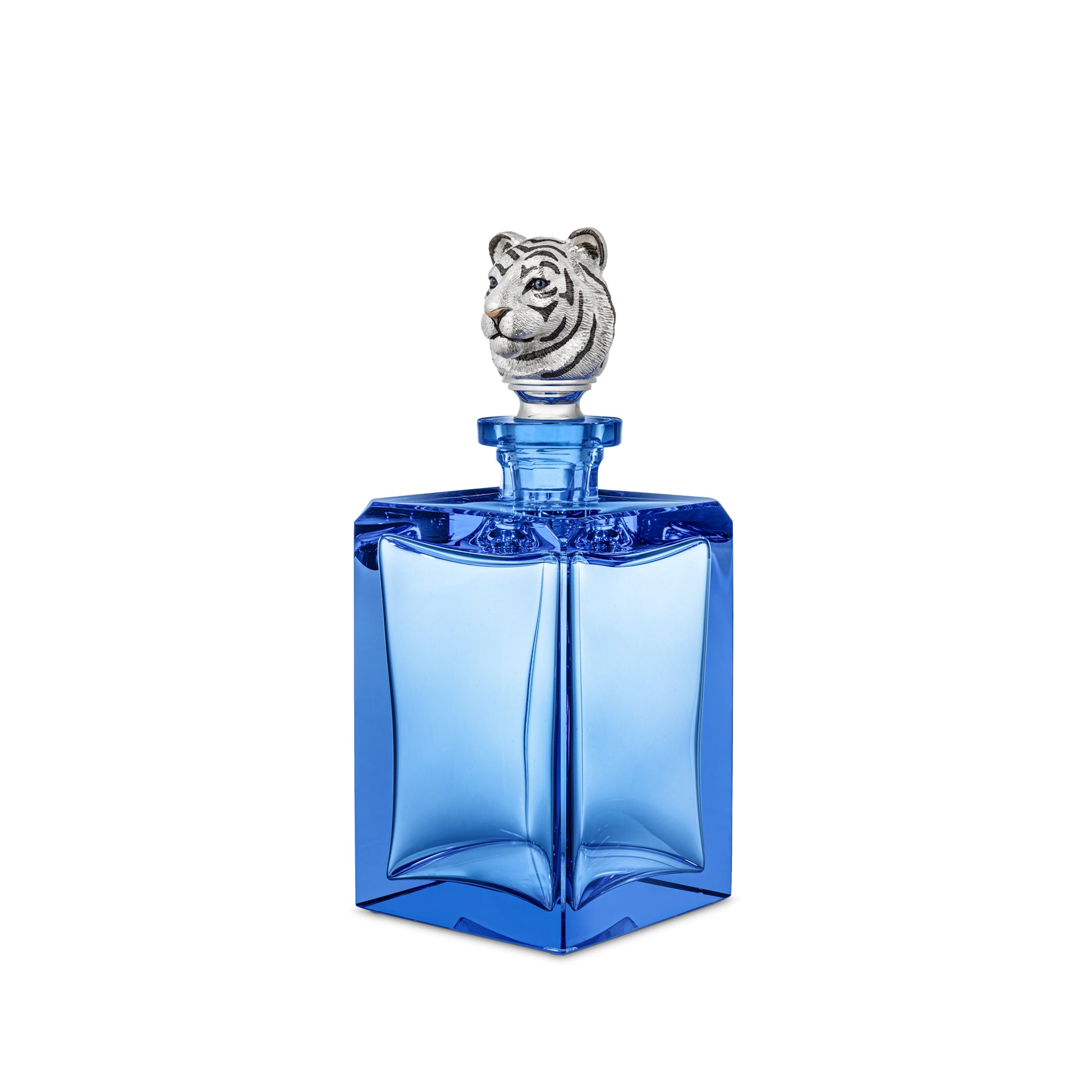 手作業で研磨されたクリスタルのストッパーに、精巧に型取り鋳造されたスターリングシルバーの虎の頭が取り付けられたデカンタのサファイアブルーの色合いは、虎の魅惑的な目を映し出しています。吹きガラスのデカンタは熟練した職人によって手作りされており、わずかな違いが各作品の独自性を高めています。卓越した職人技と洗練された素材により、Asprey デカンタは時代を超えた英国の贅沢の象徴となっています。