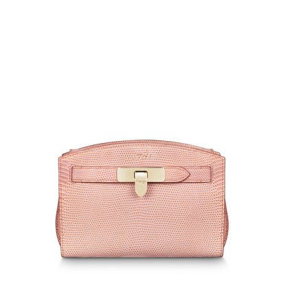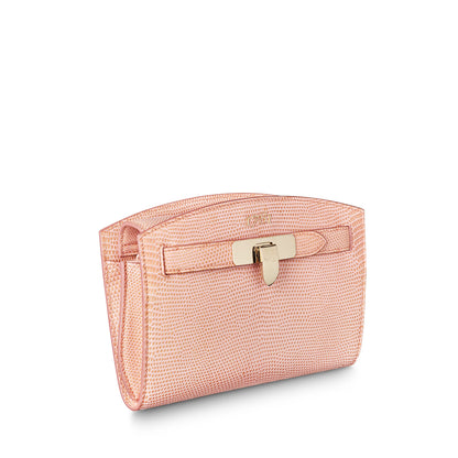 The 1781 Pochette features a lizard exterior in a delicate pink hue with whitened highlights, adding an element of sophistication to any outfit. The interior is lined with lambskin, ensuring a luxurious feel every time it is carried.
