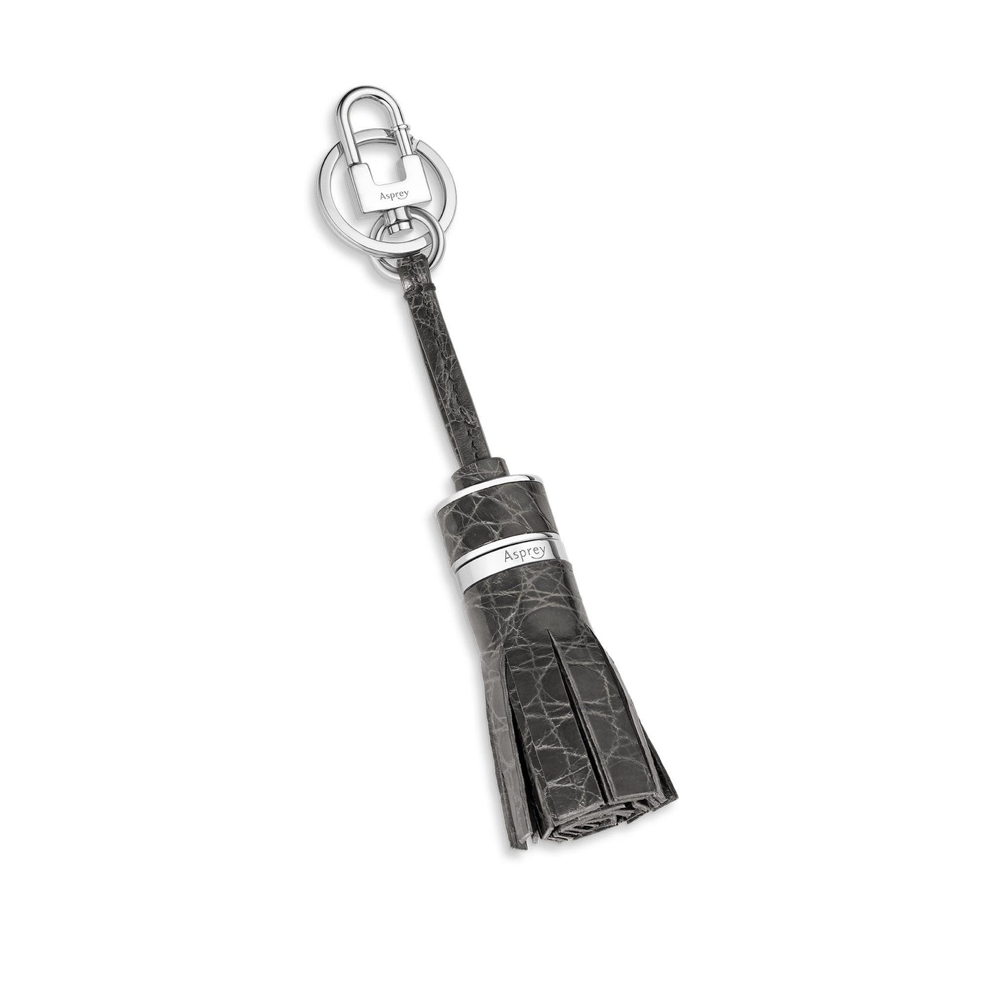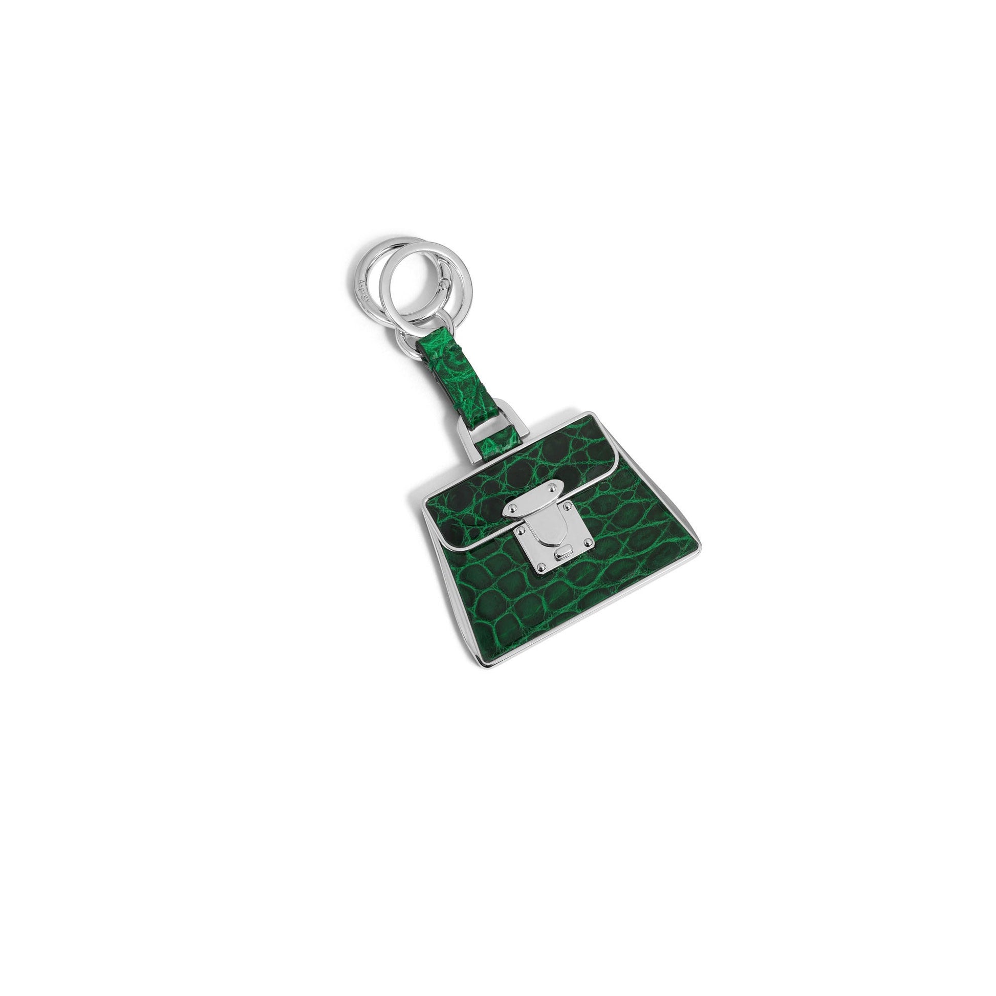 The Asprey Bond Street 167 charm and key holder in aubergine crocodile is expertly crafted by skilled artisans. The miniature Asprey handbag on this key holder is sculpted in palladium plated brass and expertly inlaid with luxurious aubergine crocodile. It is perfect for adding a touch of elegance to any set of keys or handbag. Asprey is known for its tradition of excellence and the Bond Street 167 charm & key holder is a shining example of this commitment to quality and craftsmanship. This accessory is sure to be treasured for years to come.