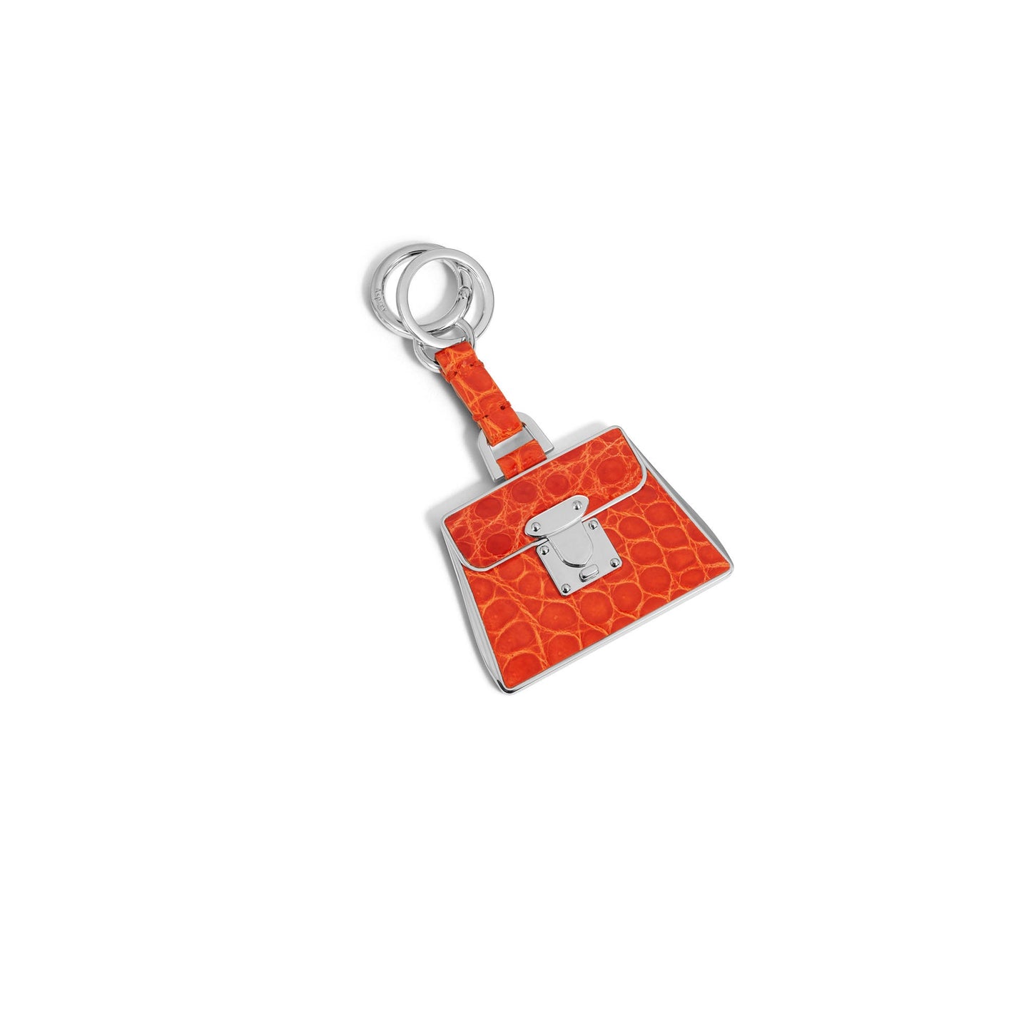 The Asprey Bond Street 167 charm and key holder in orange crocodile is expertly crafted by skilled artisans. The miniature Asprey handbag on this key holder is sculpted in palladium plated brass and expertly inlaid with luxurious orange crocodile. It is perfect for adding a touch of elegance to any set of keys or handbag. Asprey is known for its tradition of excellence and the Bond Street 167 charm & key holder is a shining example of this commitment to quality and craftsmanship. This accessory is sure to be treasured for years to come.