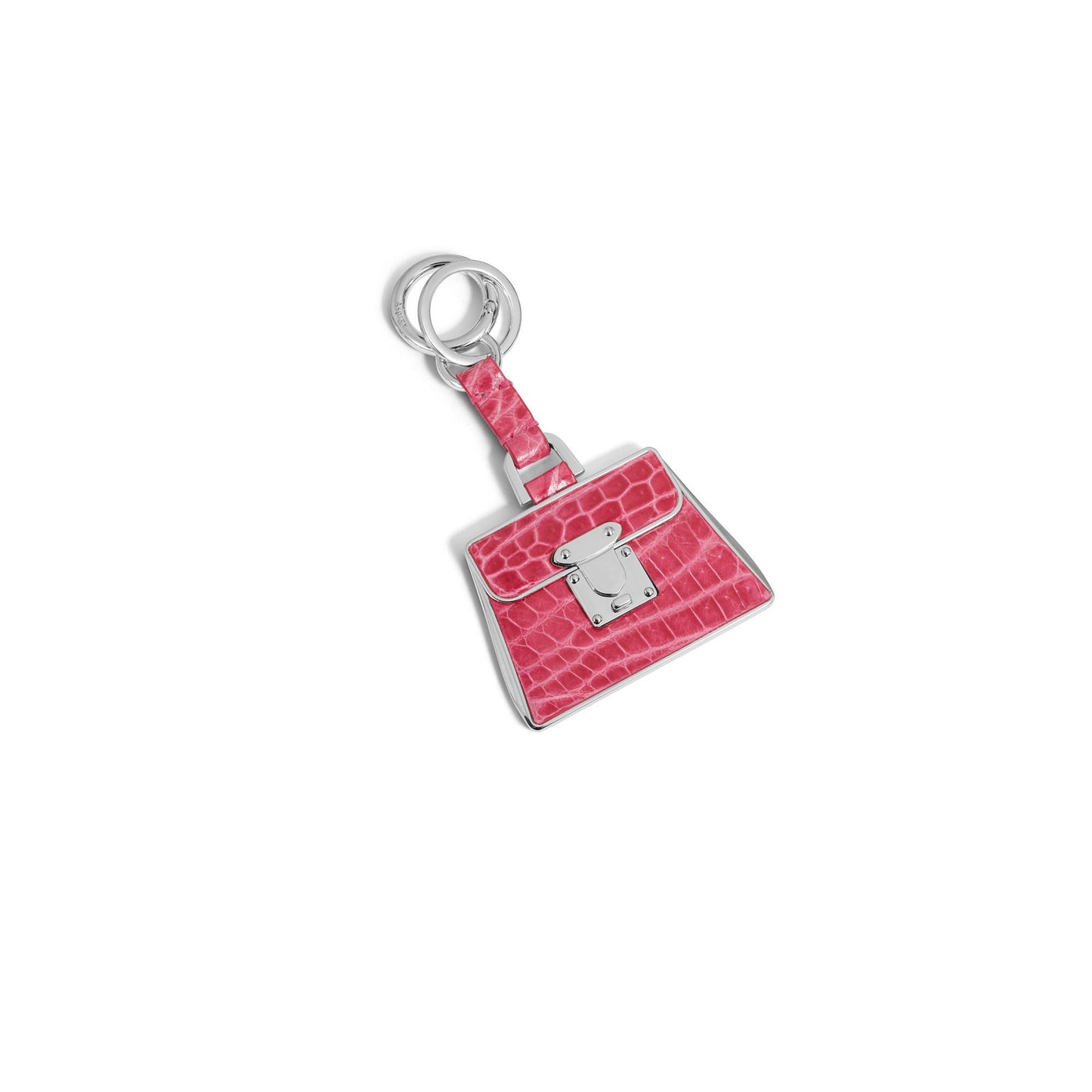 The Asprey Bond Street 167 charm and key holder in magenta crocodile is expertly crafted by skilled artisans. The miniature Asprey handbag on this key holder is sculpted in palladium plated brass and expertly inlaid with luxurious magenta crocodile. It is perfect for adding a touch of elegance to any set of keys or handbag. Asprey is known for its tradition of excellence and the Bond Street 167 charm & key holder is a shining example of this commitment to quality and craftsmanship. This accessory is sure to be treasured for years to come.