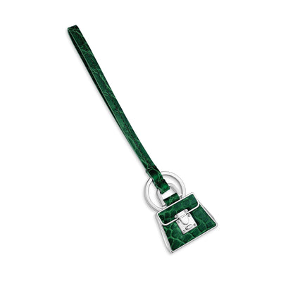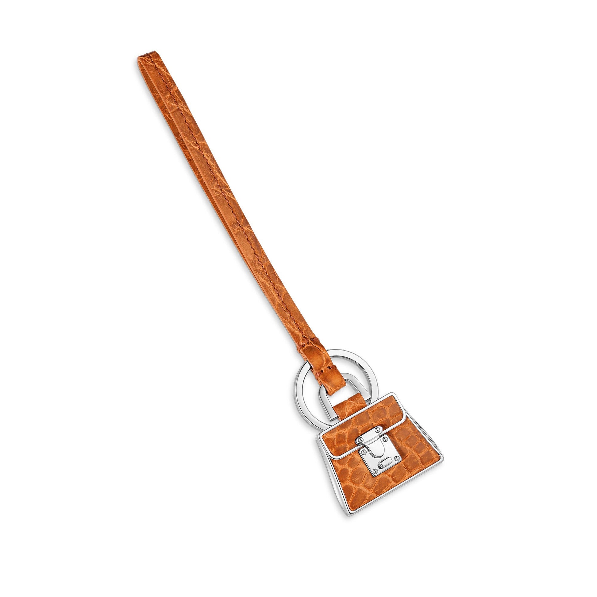 The Asprey Bond Street 167 mini charm and key holder in cognac crocodile is expertly crafted by skilled artisans. The micro miniature Asprey handbag on this key holder is sculpted in palladium plated brass and expertly inlaid with luxurious cognac crocodile. It is perfect for adding a playful touch to any set of keys or handbag. Asprey is known for its tradition of excellence and this charm & key holder is a shining example of this commitment to quality and craftsmanship. This accessory is sure to be treasured for years to come.