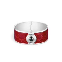The Button Cuff features an inlay of emerald crocodile skin, while the button motif is inlaid with a semi-precious cabochon stone that serves as both a clasp and a fashion statement.