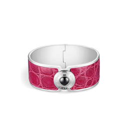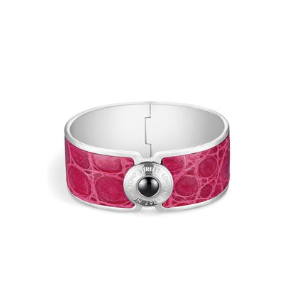 Crafted with precision and plated with a palladium finish, the elliptical design of the cuff ensures a clean and comfortable fit around the wrist, and its clever hinge mechanism allows for easy wearing. This cuff features exclusive precision-cut hardware, ensuring a secure and elegant click-close fastening.
