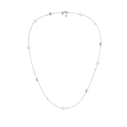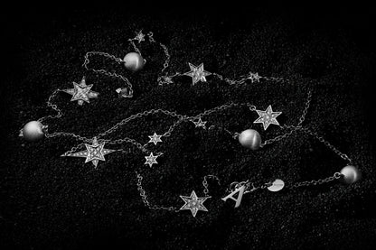 The stars that adorn this magnificent necklace are kissed by the shimmering touch of pavé diamonds, creating a constellation of pure radiance. Each star's delicate sparkle illuminates your path with an ethereal glow, captivating all who behold it.