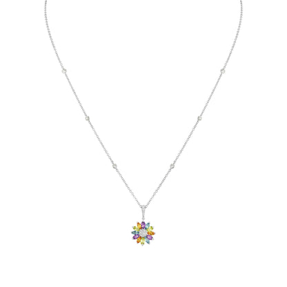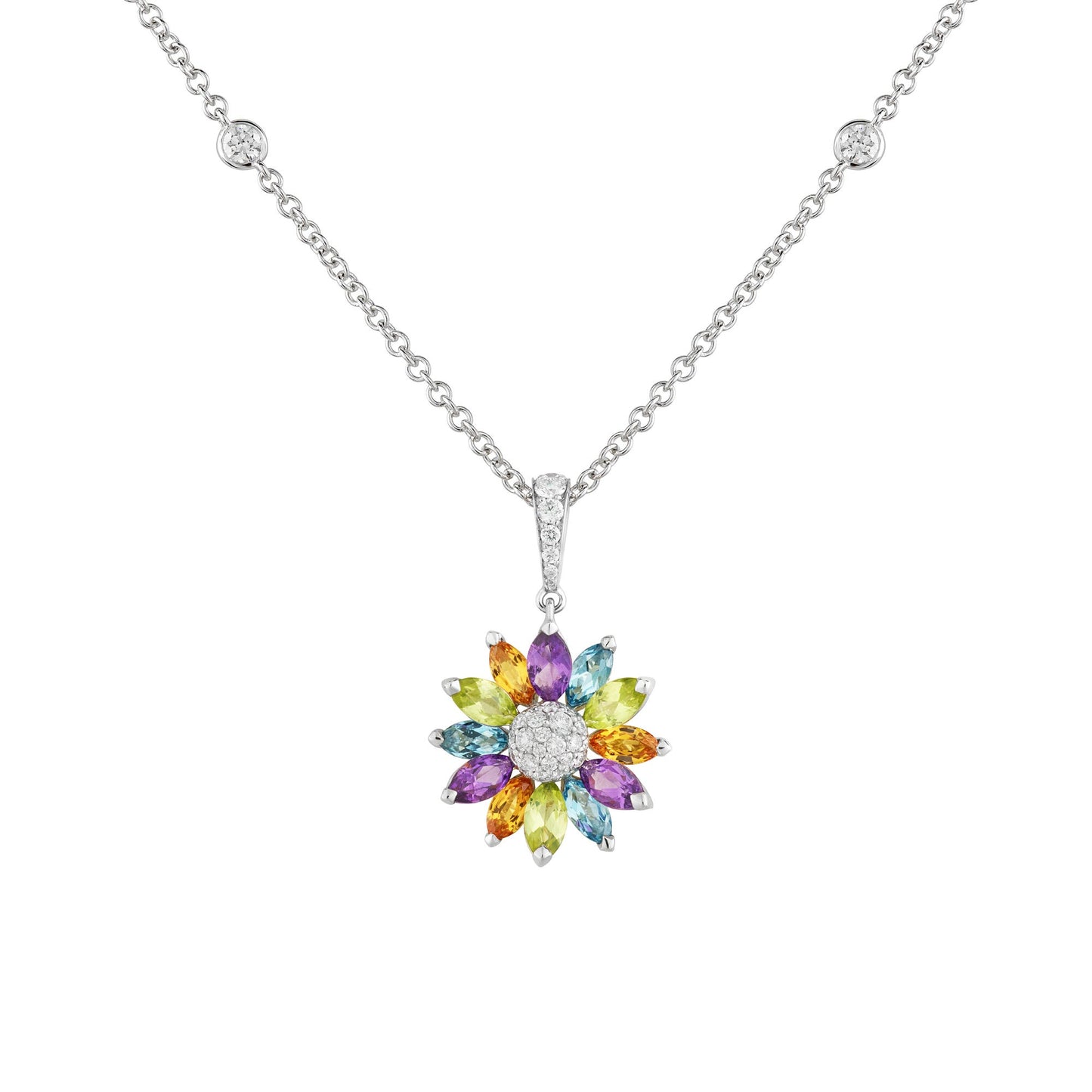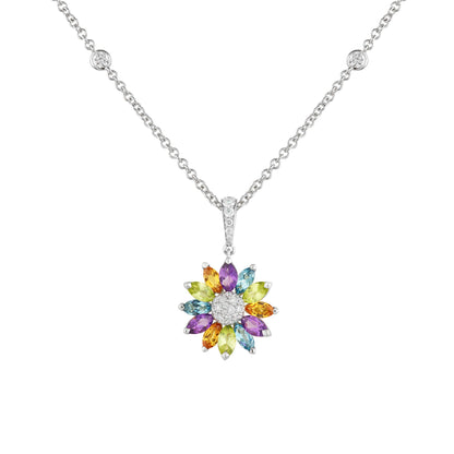 This easy to wear, captivating Multi Daisy Small Pendant is a true masterpiece of intricate craftsmanship. The exquisite pendant showcases a dainty daisy flower adorned with 12 marquise-cut gemstones, including mesmerising amethysts, aquamarines, peridots, and yellow sapphires. At the heart of the flower, a brilliant-cut diamond centre delicately rests in a pavé setting, adding a touch of brilliance and elegance.