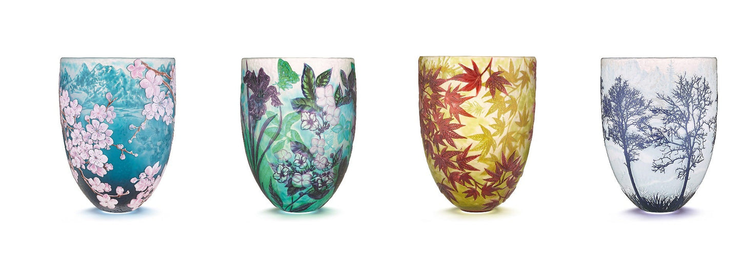 Each vase in the Asia Four Seasons collection has been designed and crafted to fulfil a specific Asprey brief by Jonathan Harris, the renowned British contemporary glass artist. Combining traditional cup-casing techniques with contemporary cameo carving methods, these vases are the epitome of artistic fusion. Mouth blown and built up in layers of rich transparent glass colours, the vase boasts multiple strata of pure colour, creating a blank canvas for the carving work. Through a meticulous process involving fine diamond drill engraving and 'sand carving' techniques, the vases are hand-carved with exquisite detail and relief on both the interior and exterior.