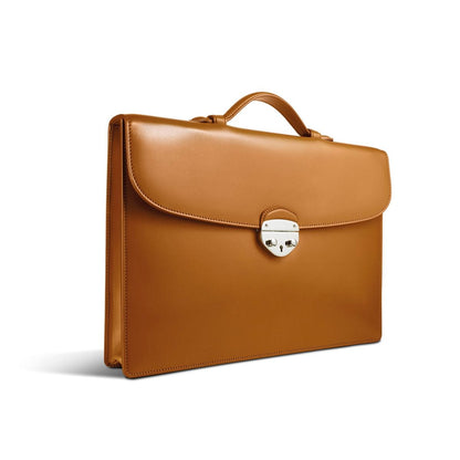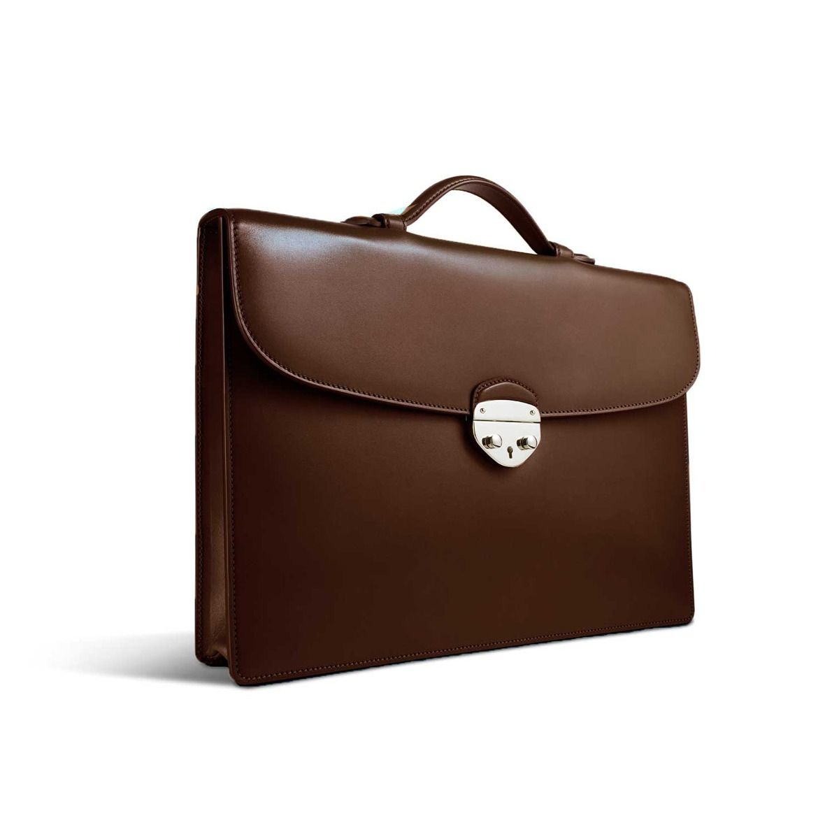 The Asprey Hanover 1 Briefcase, part of the Hanover collection, is a sleek and practical accessory of the male wardrobe. Crafted with precision in workshops, it has a black saddle leather exterior and a calf leather interior. This interior compartment has one separate section which include two pen pockets, credit card pockets, and a phone pocket for your convenience. The palladium finish hardware provides both functionality and style, securely holding your documents and belongings. With its understated elegance and meticulous craftsmanship, this briefcase is a testament to Asprey's commitment to quality.