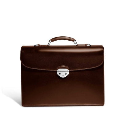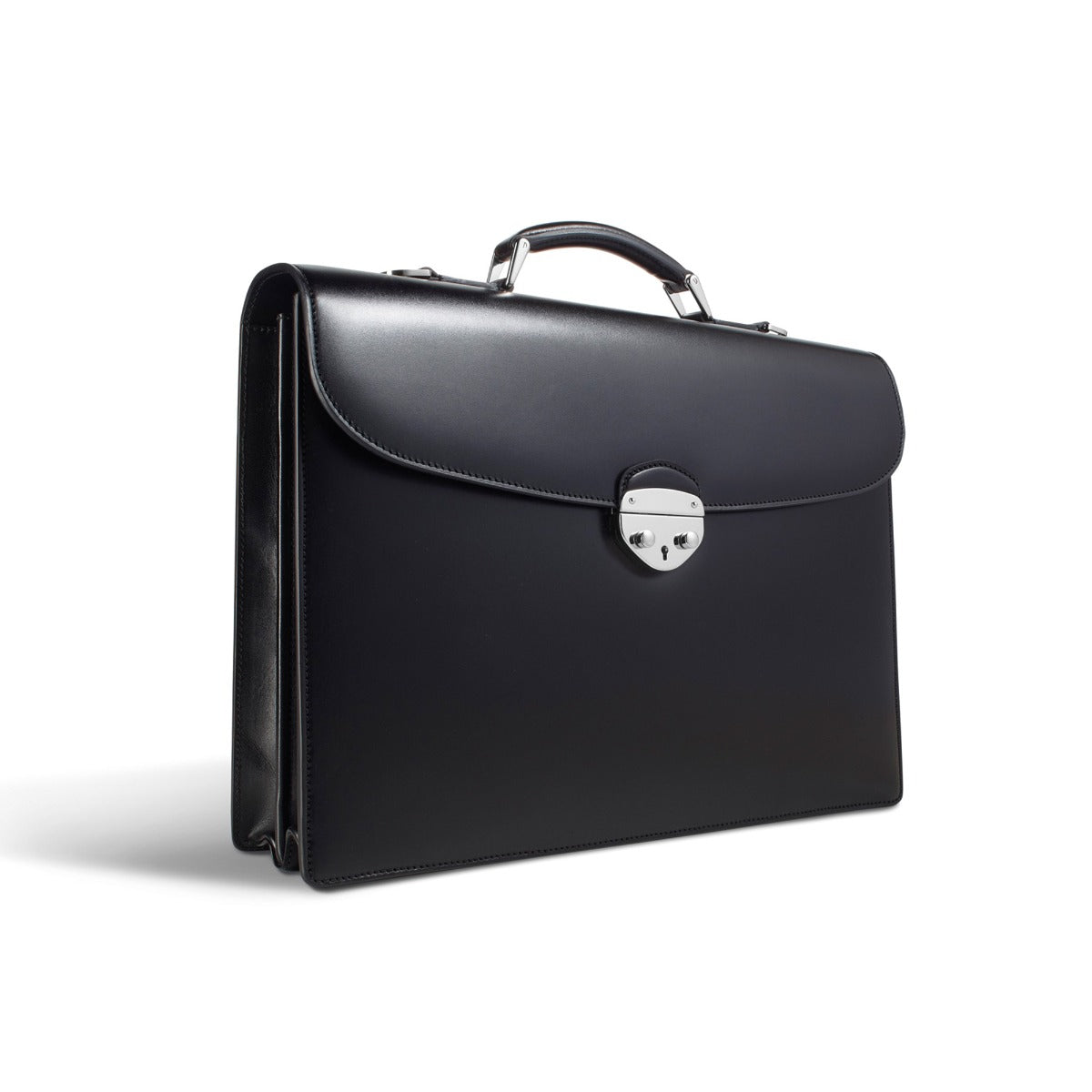 The Asprey Hanover 2 Briefcase, part of the Hanover collection, is a sleek and practical accessory of the male wardrobe. Crafted with precision in workshops, it has a black saddle leather exterior and a calf leather interior. This interior compartment has two separate sections which include two pen pockets, credit card pockets, and a phone pocket for your convenience. The palladium finish hardware provides both functionality and style, securely holding your documents and belongings. With its understated elegance and meticulous craftsmanship, this briefcase is a testament to Asprey's commitment to quality.