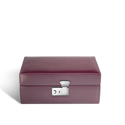 In a regal oxblood hue, the Hanover Box is enveloped in supple saddle leather, radiating a sense of timeless sophistication. The interior is graced with a silky mauve lining, providing a plush haven for your treasured possessions. Within its spacious three compartments, you'll find ample room for your cherished jewellery and other accessories.