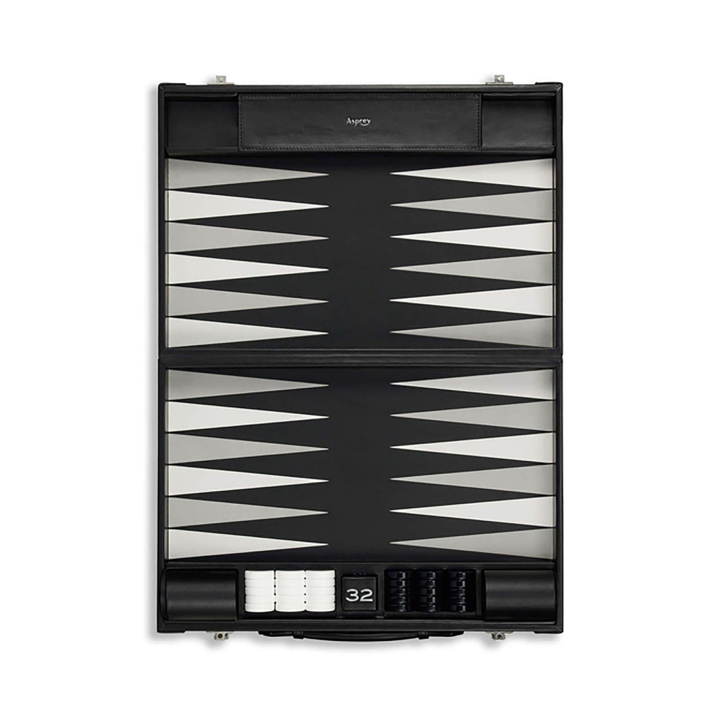 The ball-cornered dice—designed to roll across the leather—are casino-quality precision dice. The pebble grain leather counters glide effortlessly across the playing field. When not in use, the game pieces are neatly stored in leather-lined compartments, ensuring everything remains in place. The case is secured with palladium-finished key locks, preserving the set’s exceptional quality and making it both an elegant display and a reliable companion for years to come.