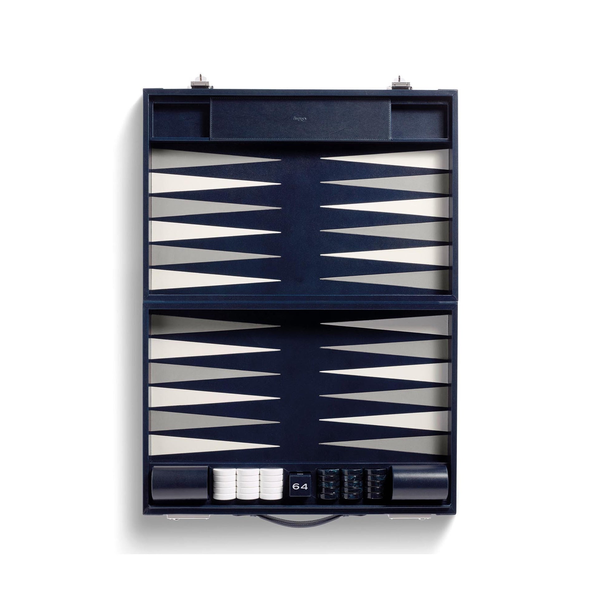 The Hanover Backgammon Set is a carefully considered combination of materials - selected to suit all levels of play, from the professional player to the recreational and new player. The exterior case of saddle leather features defining stitch lines and burnished edges. The smooth lambskin of the playing field is specially selected for speed of play, and the points are cut and inlaid with finesse. The ball-cornered dice - to roll across the leather - are casino quality precision dice. Resin stones (or counters) will move quickly across the playing field, and when not in play are stored in leather lined compartments alongside the leather dice cups and the doubling cube. The case closes with palladium finish key locks. The Hanover Backgammon, available in three sizes, will adorn your home or make a memorable gift.