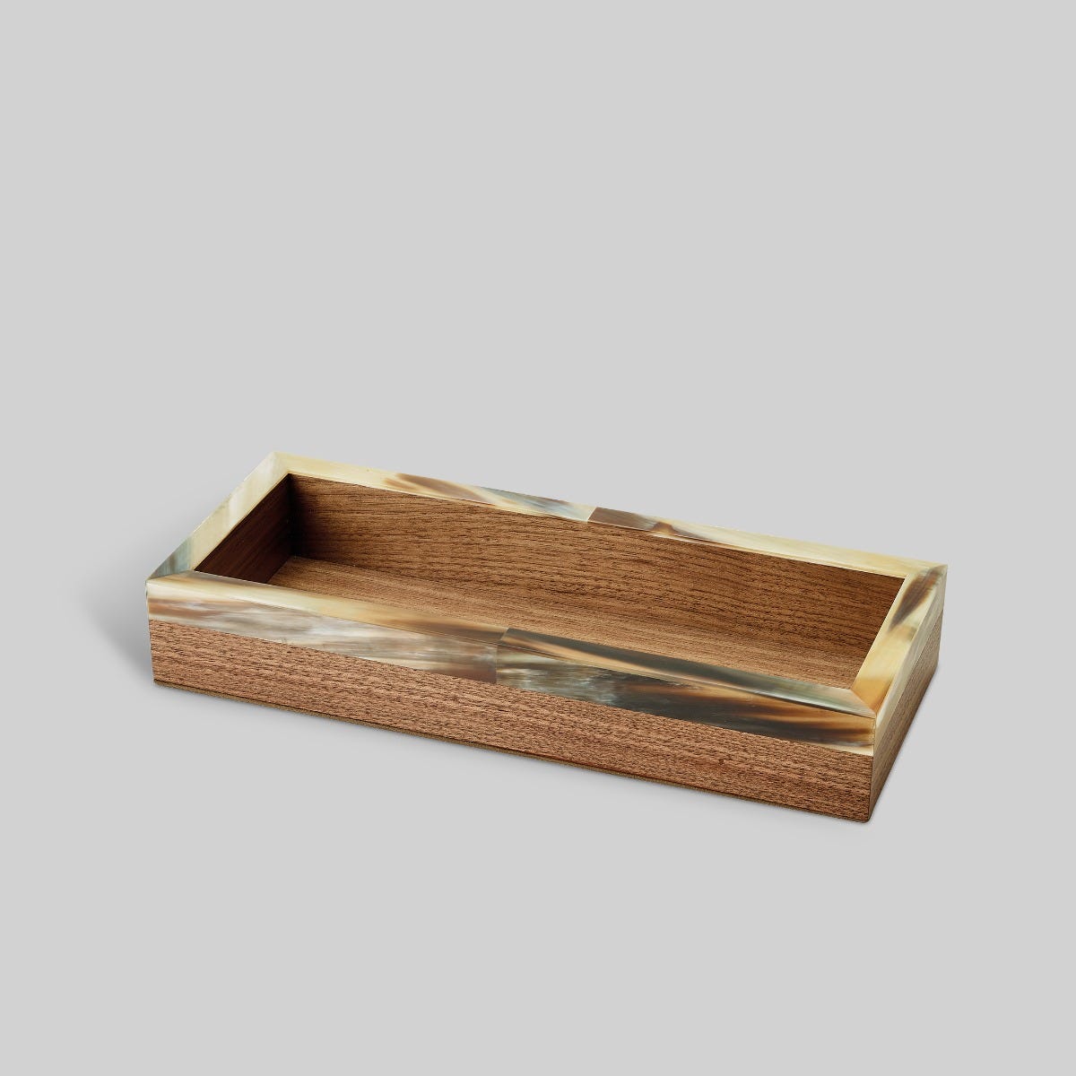 The Horn & Walnut Wood Trinket Tray features a walnut veneer wood body paired with matte horn detailing and a leather-lined base blind-embossed with the Asprey logo. Its dimensions of 27 cm x 11 cm x 4.5 cm (10.5″ x 4.5″ x 2″) make it a sophisticated home for small essentials. Crafted by hand, the piece inherits unique variations in the horn, adding individual character to each tray.