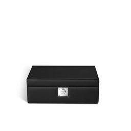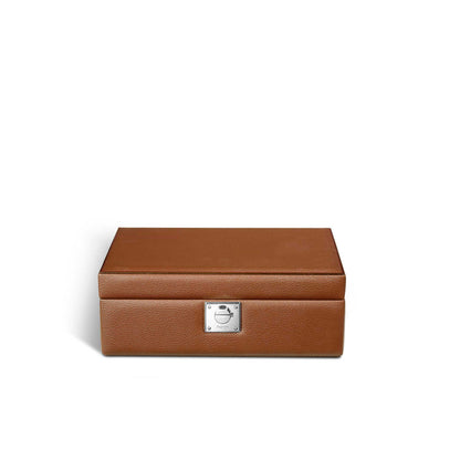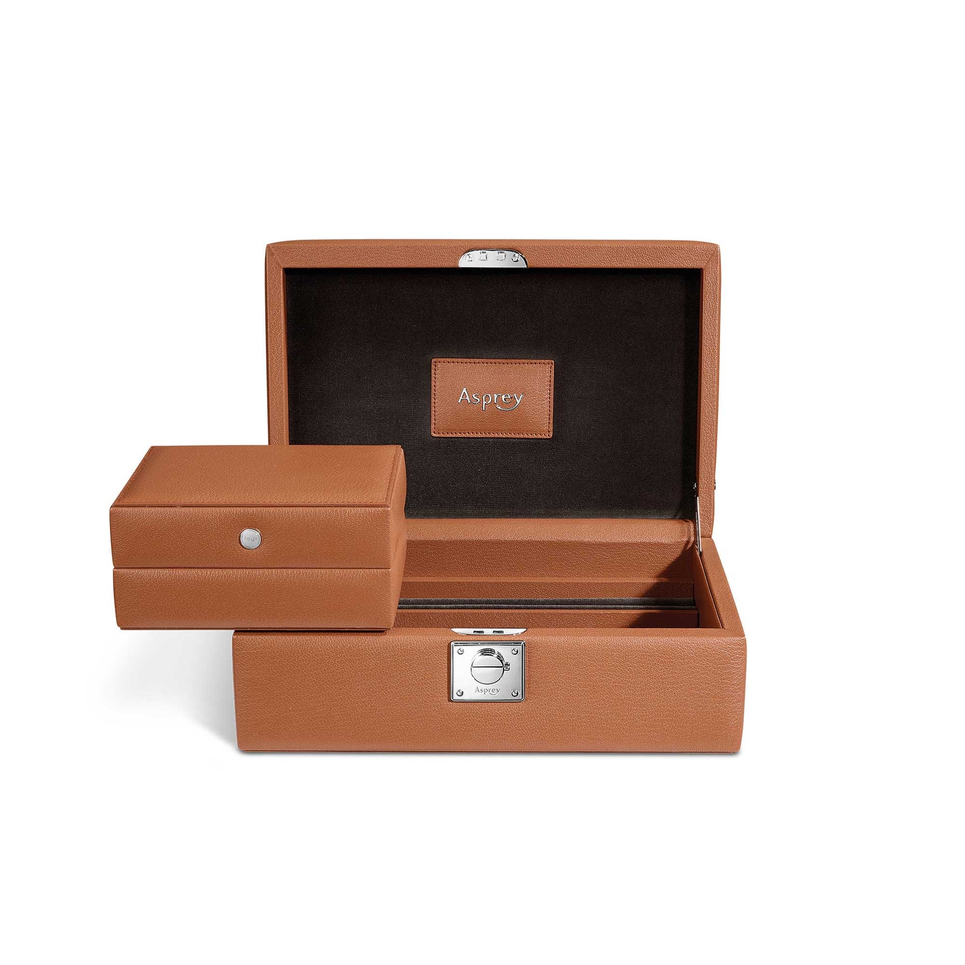 Sleek, elegant and endlessly functional, this Leigh Jewel Case has ample space for jewellery, cufflinks and other mementos. This jewel case is complete with a removable travel box, ideal for stowing in your luggage and transferring to the hotel safe. The pebble grain leather is gently padded, the interior compartments are completely fitted out with pebble grain leather and finished with velvet cushion bases and velvet protective cushions. The lock and other metal accessories, all exclusive Asprey designs, are crafted from solid brass, and finished with palladium. he The Asprey logo is spelled out in letters on the inside of the lid, the lock has a hinged keyhole cover and the box is complete with a tasselled key.