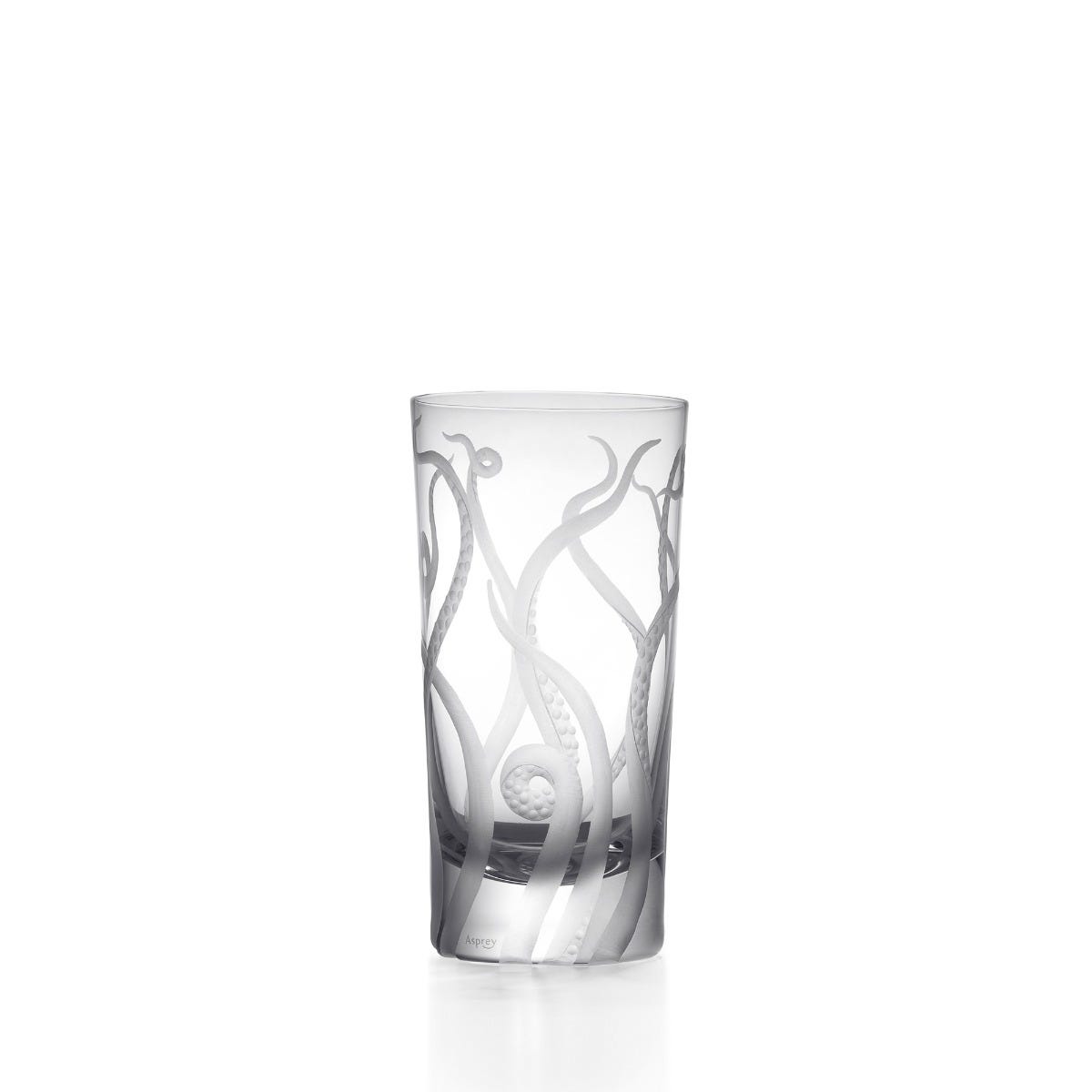 Elevate your drinking experience with an Asprey highball, part of the Octopus collection. Mouth-blown and crafted from lead-free crystal, it showcases a hand-engraved octopus design, skilfully created using a traditional diamond wheel cutter. The sea green hue of this crystal tumbler is a captivating addition to your collection, making it a truly exquisite piece to showcase and enjoy.