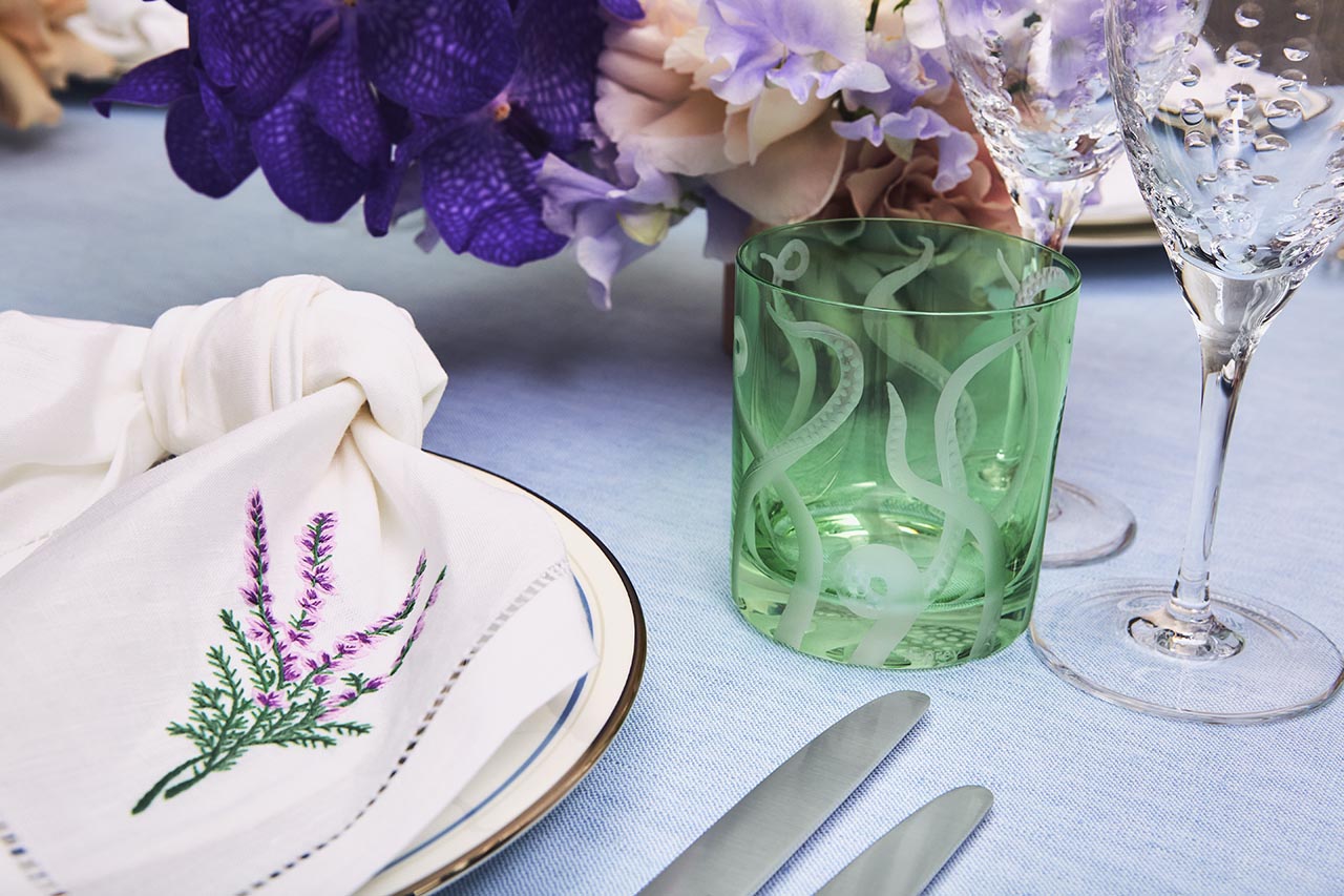 Elevate your drinking experience with an Asprey double old fashioned tumbler, part of the Octopus collection. Mouth-blown and crafted from lead-free crystal, it showcases a hand-engraved octopus design, skilfully created using a traditional diamond wheel cutter. The blue hue of this crystal tumbler is a captivating addition to your collection, making it a truly exquisite piece to enjoy.
