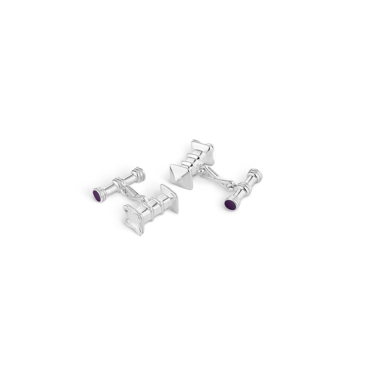 The Asprey Pagoda Cufflinks in sterling silver combine crisp geometry with refined craftsmanship. Their pagoda-inspired form brings structure and balance to any cuff. Finished in hallmarked sterling silver and accented with subtle purple enamel on the T-bar fitting, these cufflinks deliver understated sophistication for formalwear or elevated day dress.