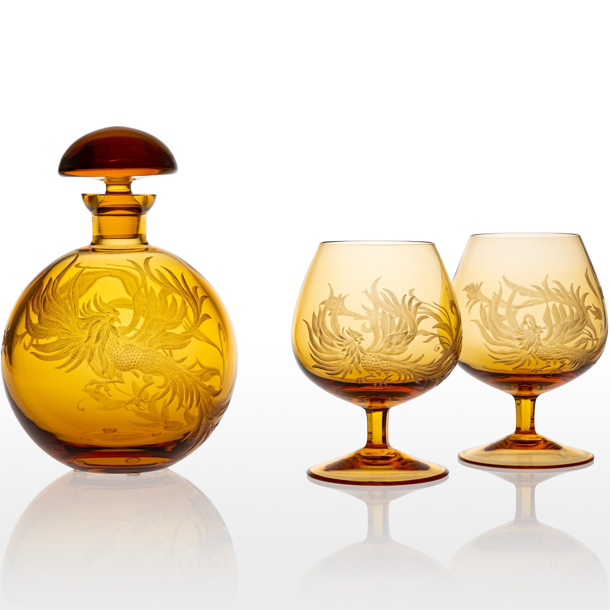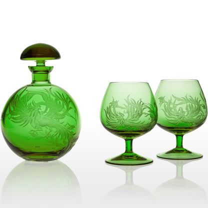The Asprey Peridot Phoenix Decanter Set, inspired by the mythical bird symbolising hope and transformation, reflects Asprey's commitment to timeless craftsmanship. Rooted in Chinese and Japanese cultural influences, the Phoenix design, hand-drawn by Asprey's designers, adorns the spherical decanter and glasses with a highly decorative style. Crafted using the centuries-old fixed diamond wheel engraving technique, this set embodies Asprey's dedication to traditional artistry. The result is a stunning and elegantly crafted Phoenix Brandy Decanter Set, seamlessly blending mythological inspiration with meticulous traditional craftsmanship.