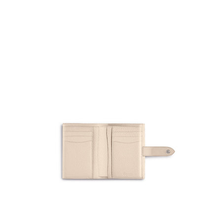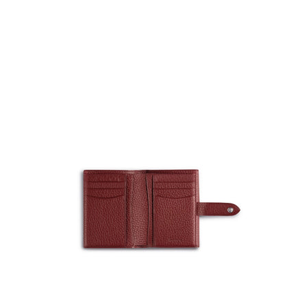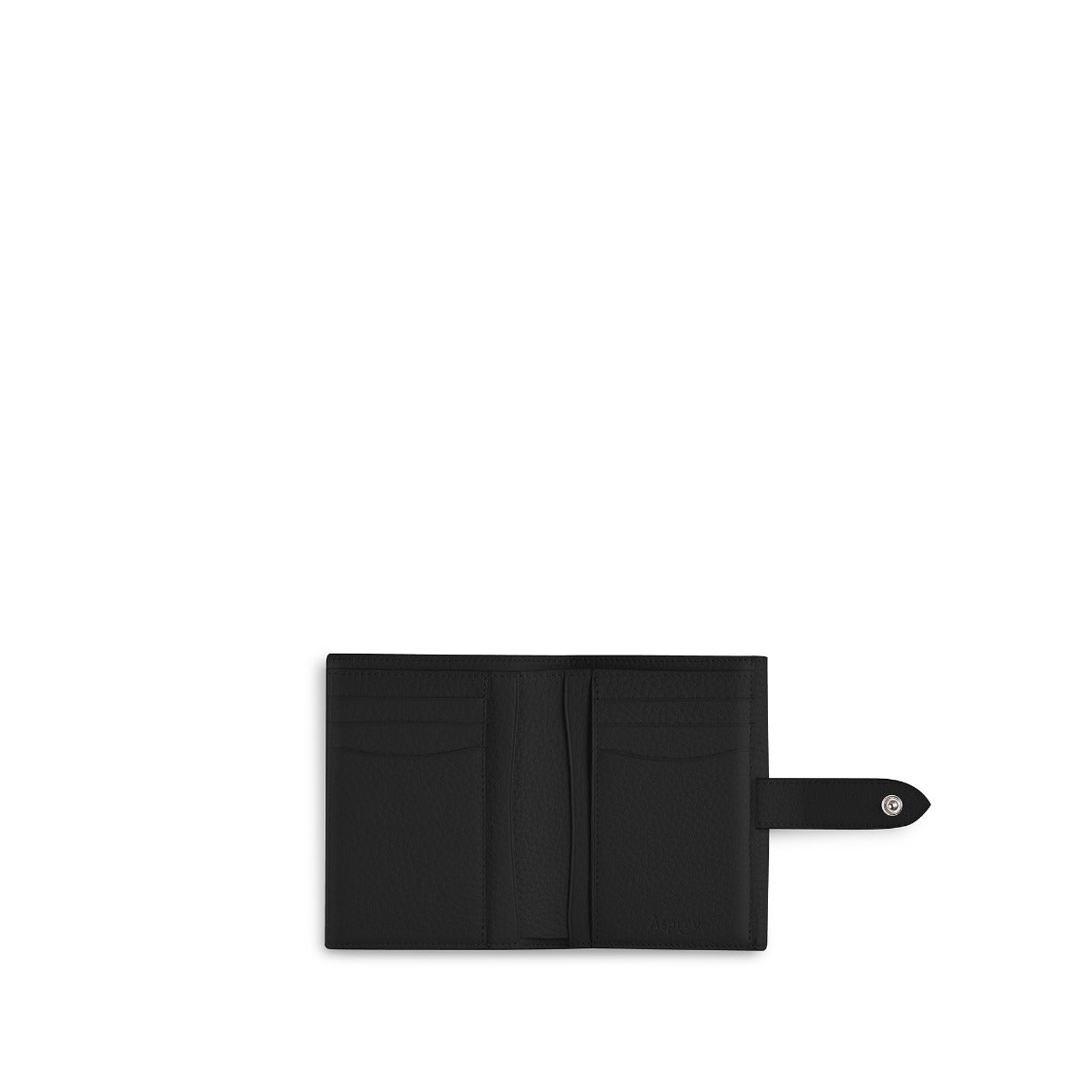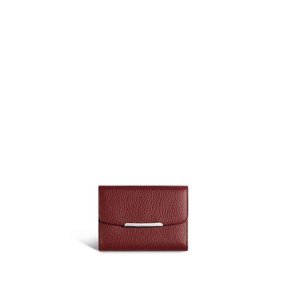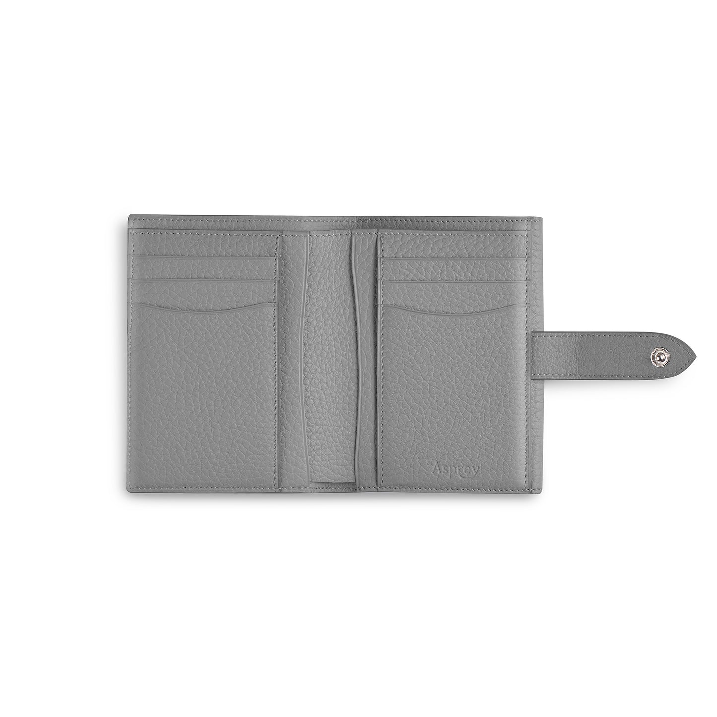 The envelope-style Regent French Purse in Silver Grey soft-grain leather is accented with a polished palladium-finish metal bar along the flap edge. Handcrafted in supple European leather, the design features a matching leather interior, a front coin section with press-button closure, and a rear panel with six credit-card pockets, one bank-note pocket, and two additional slip pockets. The compact silhouette closes with a slim tab and press-button, offering an elegant balance of form and function.