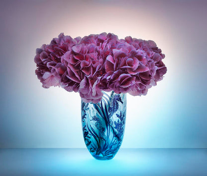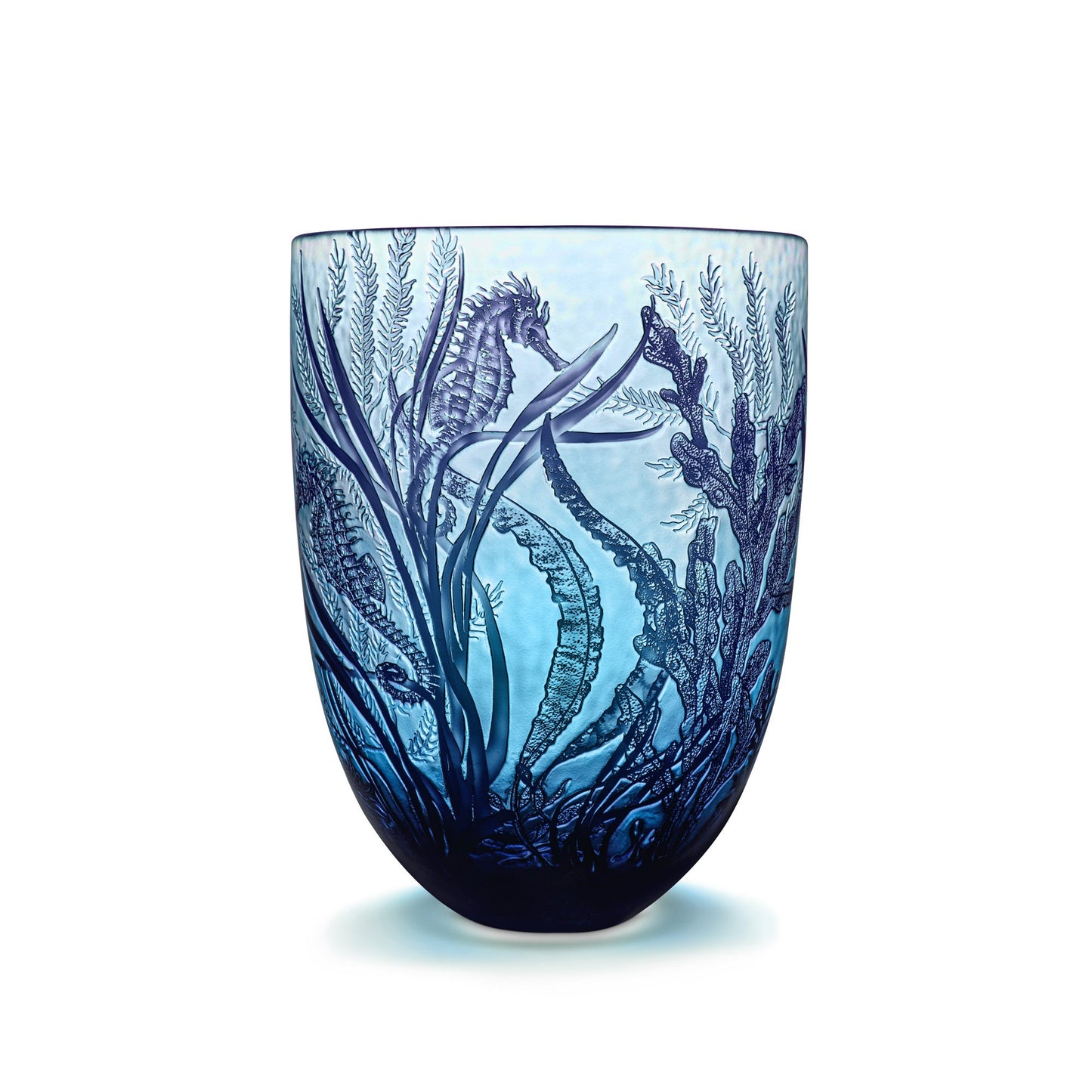 An exclusive collaboration between Asprey and Jonathan Harris, the renowned British contemporary glass artist. This lead-free glass vase is hand-carved with minute details, featuring the distinctive plant life and sea creatures of the English coastal waters. The intricate decoration is achieved by using diamond point drills and contemporary carving techniques, creating a tactile cameo in fine detail and relief. Each vase is mouth blown then layered with several enamel colours on the inside, which is then carved through to give the cameo relief effect.