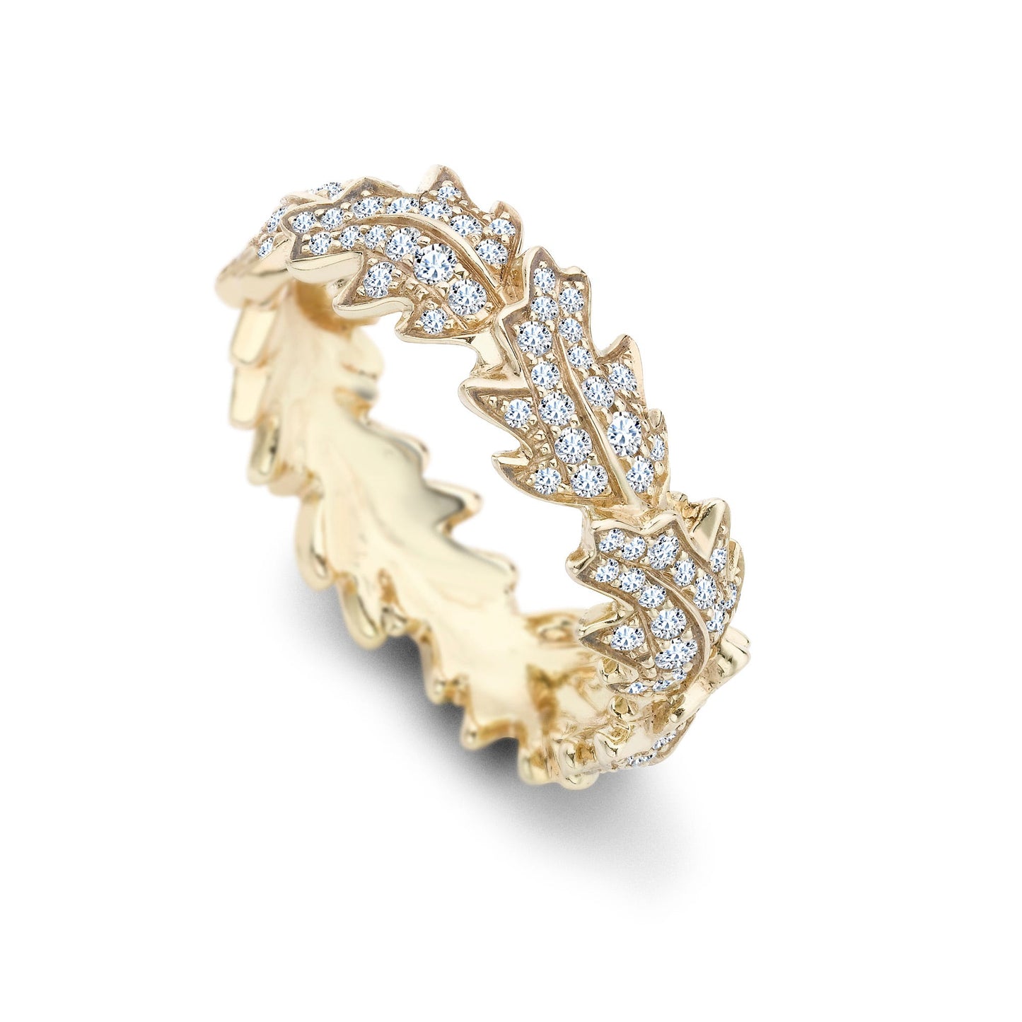 Encased in 0.75ct of brilliant-cut pavé-set diamonds, this Oak Leaf ring is a wearable work of art. It’s expertly handcrafted from 18ct gold with highly detailed leaves that emulate the oak tree’s pleasing texture. Complete the elegant set with the Woodland collection’s corresponding pieces.