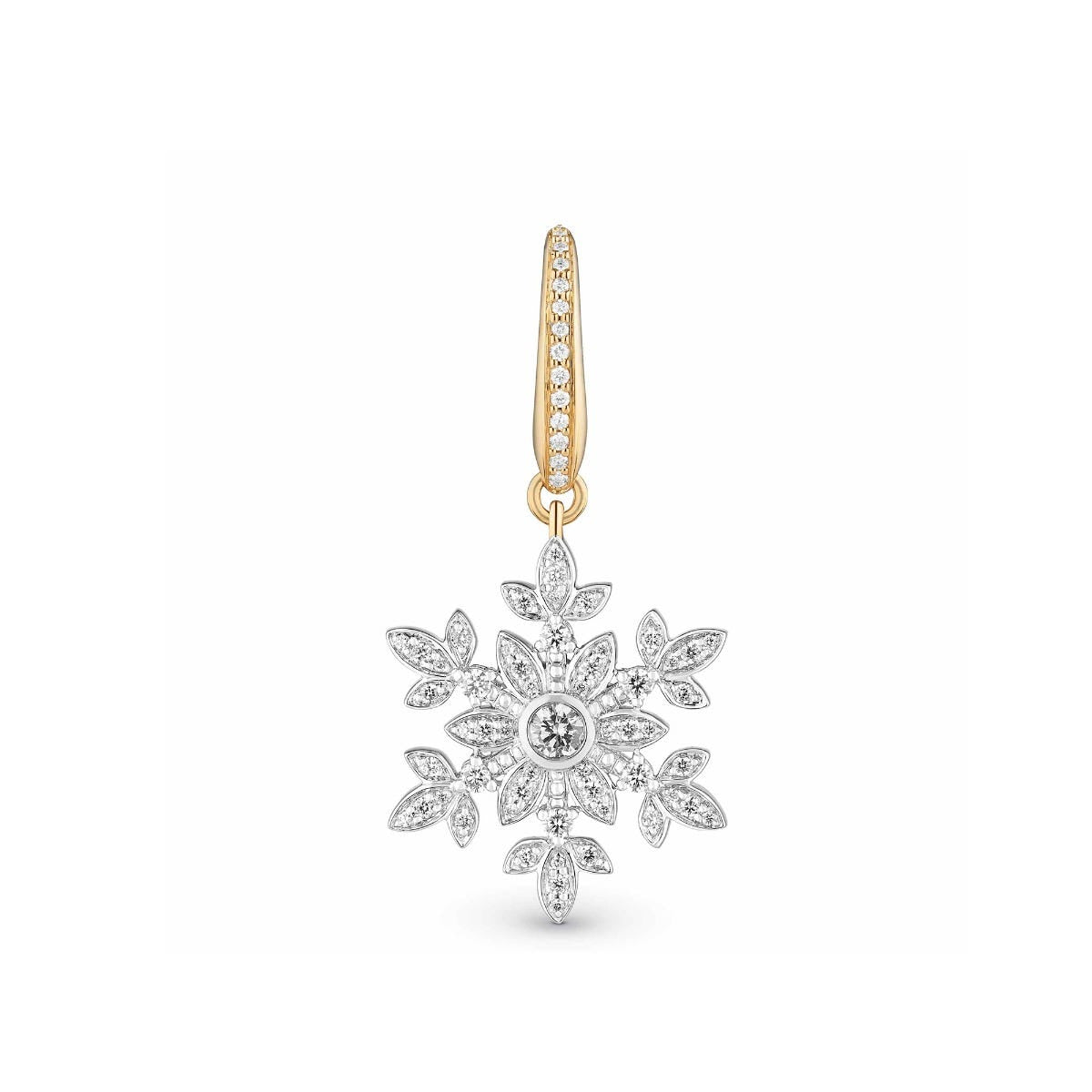 This charm is a captivating showcase of craftsmanship, boasting an intricately designed snowflake in lustrous 18ct white gold. This stunning ice crystal is adorned with a breath-taking ensemble of 50 pavé-set diamonds, which twinkle like glistening snowflakes under the winter sun. Each diamond is meticulously placed to create a harmonious symphony of brilliance, making this charm a true work of art.