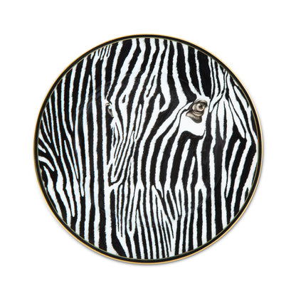 Complete your table setting with the Asprey Zebra Side Plate. Crafted from fine bone china, this collection showcases a hand-painted zebra pattern. It features a hidden eye, adding a playful touch and has a hand finished yellow gold and black trim. Asprey's meticulous craftsmanship is evident in every detail, adding a touch of refined elegance to your dining experience — a perfect complement to the Asprey Zebra Collection.